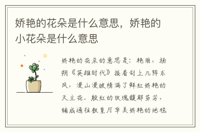 娇艳的花朵的意思是:艳丽,杨朔《英雄时代》接着刮上几阵东风,漫山漫坡绣满了鲜红娇艳的天主花。殷红的玫瑰馥郁芬芳,铺成通往教皇厅华美娇艳的地毯。郁金香飘香的季节,娇艳妩媚的女孩的笑容如花传芬芳。望着色彩艳丽的一大片樱花,我真怀疑是九天仙女把撕碎的彩缎撒向人间。