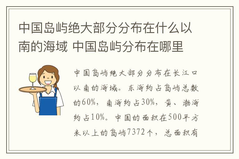 中国岛屿绝大部分分布在长江口以南的海域。东海约占岛屿总数的60%,南海约占30%,黄、渤海约占10%。