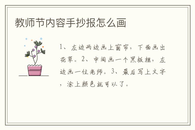 教师节内容手抄报怎么画简单又漂亮 知识分享 2月2日 编辑 童画 取消关注 关注 私信 1、左边两边画上窗帘,下面画出花草。 2、中间画一个黑板框,左边画一位老师。 3、最后写上文字,涂上颜色就可以了。 No related posts. 本文内容由互联网用户自发贡献,该文观点仅代表作者本人。本站仅提供信息存储空间服务,不拥有所有权,不承担相关法律责任。如发现本站有涉嫌抄袭侵权/违法违规的内容, 请发送邮件至 2245678901@qq.com 举报,一经查实,本站将立刻删除。 给TA打赏 共{{data.count}}人 人已打赏