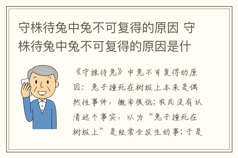 《守株待兔》中兔不可复得的原因:兔子撞死在树桩上本来是偶然性事件,概率很低;农民没有认清这个事实,以为“兔子撞死在树桩上”是经常会发生的事;于是农民抱着侥幸的心理,在农田边每日等待,但终究没有等到下一只撞死的兔子。
