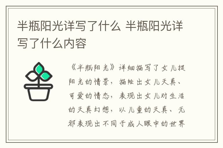 《半瓶阳光》详细描写了女儿捉阳光的情景,描绘出女儿天真、可爱的情态,表现出女儿对生活天真纯洁的幻想,以儿童的天真、无邪表现出不同于成人眼中的世界。