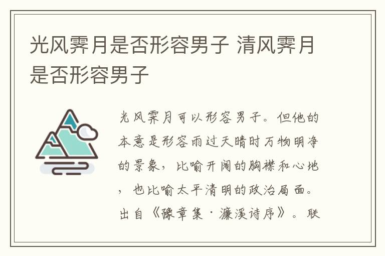 光风霁月可以形容男子。但他的本意是形容雨过天晴时万物明净的景象,比喻开阔的胸襟和心地,也比喻太平清明的政治局面。出自《豫章集·濂溪诗序》。联合式;作宾语、定语;比喻开阔的胸襟和心地。例句:大家都很喜欢和老周交往,因为这人人品甚高,胸中洒落,如光风霁月。