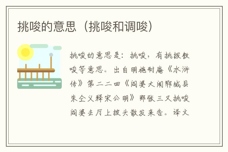 挑唆的意思是:挑唆,有挑拨教唆等意思。出自明施耐庵《水浒传》第二二回《阎婆大闹郓城县朱仝义释宋公明》那张三又挑唆阎婆去厅上披头散发来告。译文那张三又去挑唆阎婆来厅堂上,披头散发的来打报告。