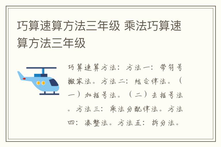 巧算速算方法:方法一:带符号搬家法。方法二:结合律法。(一)加括号法。(二)去括号法。方法三:乘法分配律法。方法四:凑整法。方法五:拆分法。方法六:巧变除为乘。方法七:裂项法。