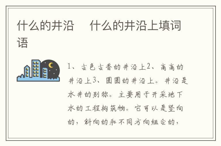 1、古色古香的井沿上2、高高的井沿上3、圆圆的井沿上。井沿是水井的别称。主要用于开采地下水的工程构筑物。它可以是竖向的,斜向的和不同方向组合的,但一般以竖向为主,可用于生活取水、灌溉。也可用于躲避隐藏或贮存一些东西等。根据地下水的埋藏分布,含水层岩性结构,人类创造了多种多样的井型。