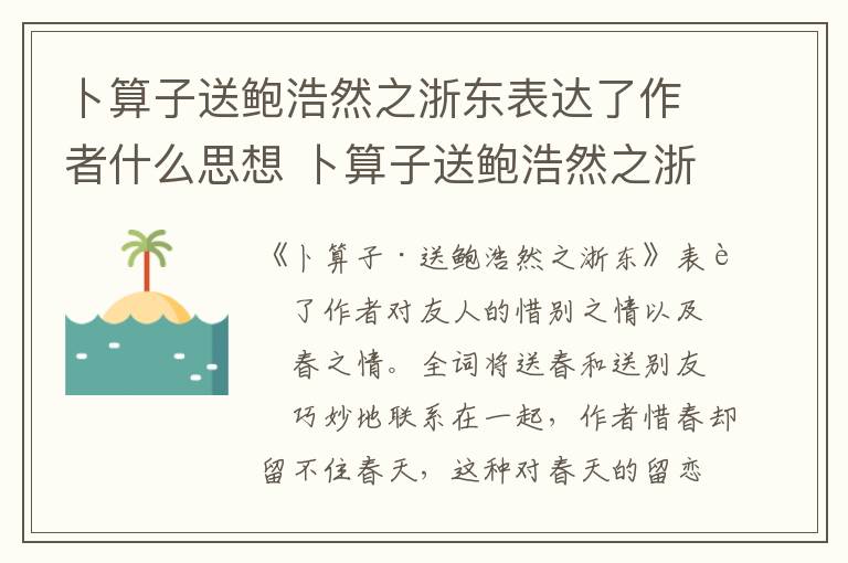 《卜算子·送鲍浩然之浙东》表达了作者对于即将远行的友人的惜别之情以及惜春之情。全词将送春和送别友人巧妙地联系在一起,作者惜春却留不住春天,这种对春天的留恋正如作者对友人的惜别,在惜春之情中更含有离别伤情,使得离愁更深。