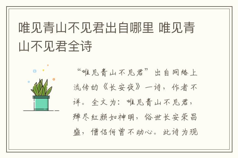 “唯见青山不见君”出自网络上流传的《长安夜》一诗,作者不详。全文为:唯见青山不见君,殚尽红颜如神明,俗世长安荣昌盛,僧侣何曾不动心。此诗为现代人根据某仿古剧所编写,因为我国古代并未有“神明”这个词。