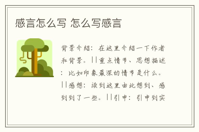所谓感言就是获得了某项奖励而发的感想,也叫获奖感言。总结因为什么事而发的感想,比如:读书感想叫读后感,看电影后的感想叫观后感。