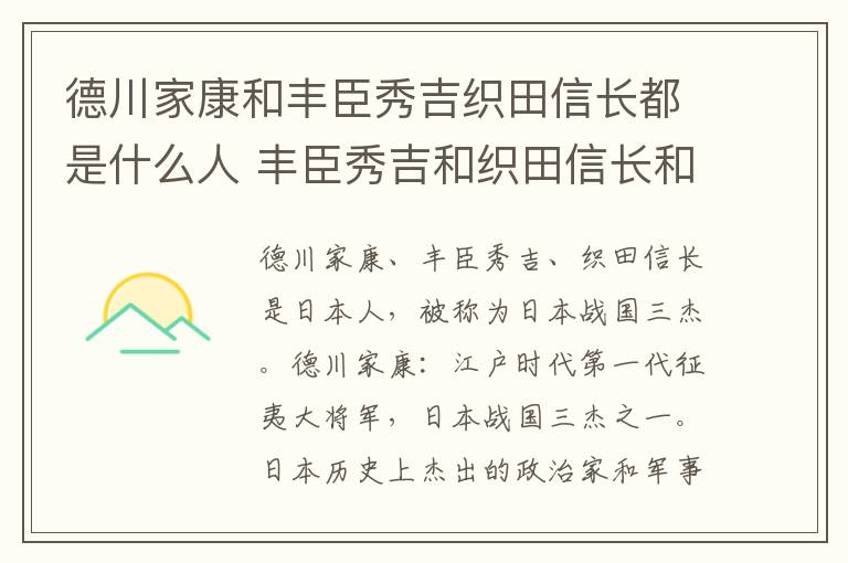 德川家康、丰臣秀吉、织田信长是日本人,被称为日本战国三杰。德川家康:江户时代第一代征夷大将军,日本战国三杰之一。日本历史上杰出的政治家和军事家。元和二年(1616年),德川家康在骏府城逝世,享年74岁。遗体埋葬在骏府的久能山,1年后被改葬到下野国日光。