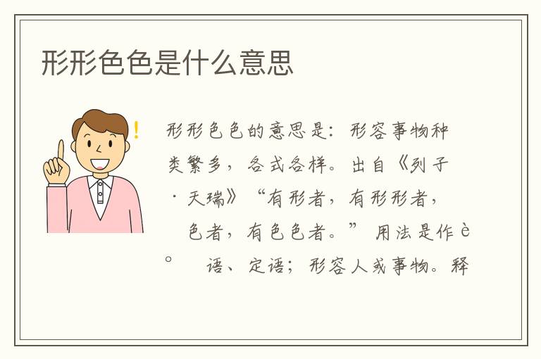 形形色色的意思是:形容事物种类繁多,各式各样。出自《列子·天瑞》“有形者,有形形者,有色者,有色色者。” 用法是作谓语、定语;形容人或事物。释义为有有形状的事物,有使有形之物成形的事物,有有颜色的事物,有使有色之物表现出颜色的事物。反义词有;千篇一律、如出一辙。