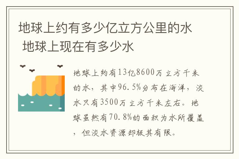 水是地球上最丰富的一种化合物。全球约有四分之三的面积覆盖着水,地球上的水总体积约有13亿8600万立方千米,其中96.5%分布在海洋,淡水只有3500万立方千米左右。