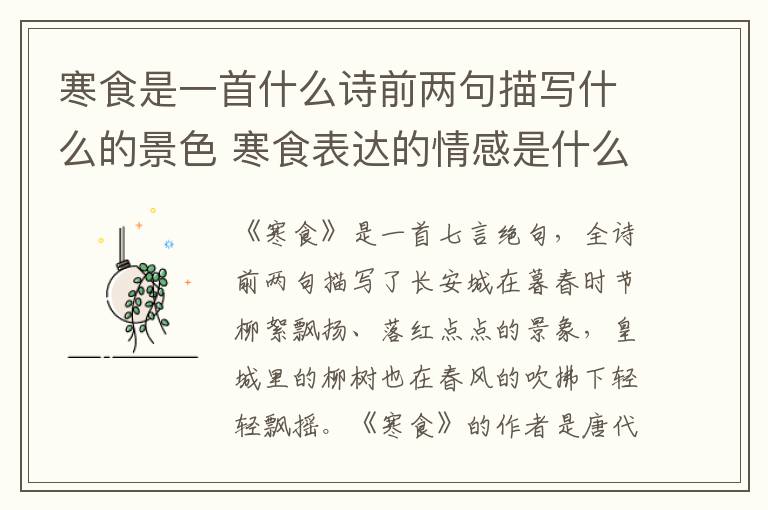 《寒食》是一首七言绝句,全诗前两句描写了长安城在暮春时节柳絮飘扬、落红点点的景象,皇城里的柳树也在春风的吹拂下轻轻飘摇。《寒食》的作者是唐代诗人韩翃。