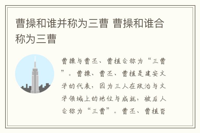 曹操与曹丕、曹植合称为“三曹”。曹操、曹丕、曹植是建安文学的代表,因为三人在政治与文学领域上的地位与成就,被后人合称为“三曹”。曹丕、曹植皆为曹操的儿子。