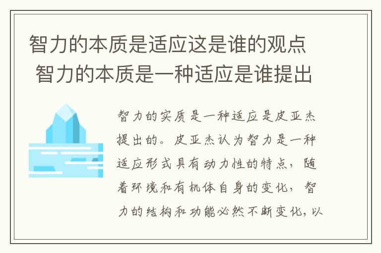 智力的实质是一种适应是皮亚杰提出的。皮亚杰认为智力是一种适应形式具有动力性的特点,随着环境和有机体自身的变化,智力的结构和功能必然不断变化,以适应变化的条件。