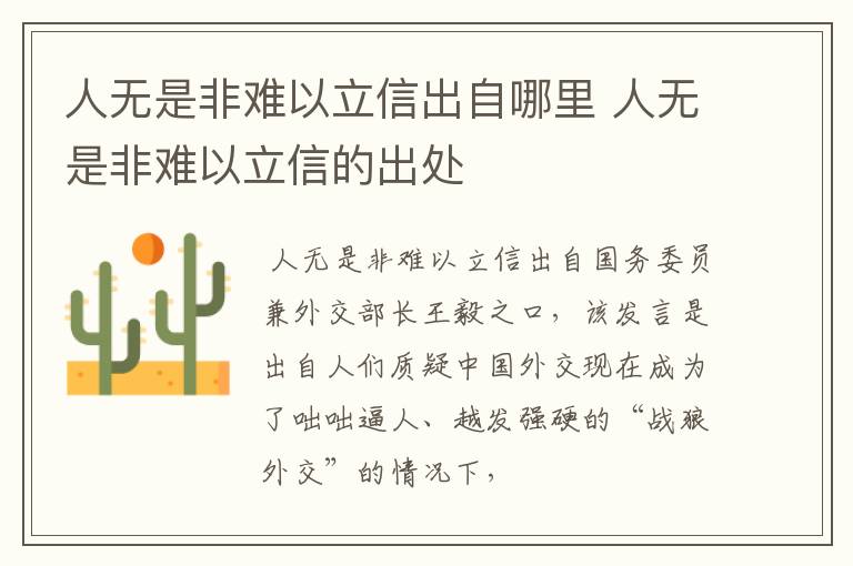 人无是非难以立信出自国务委员兼外交部长王毅之口,该发言是出自人们质疑中国外交现在成为了咄咄逼人、越发强硬的“战狼外交”的情况下,王毅针对此质疑的回应,王毅表示尊重大家提问题的权利,但该问题提出的角度还值得商榷,凡事都应该有一个是非判断的标准。