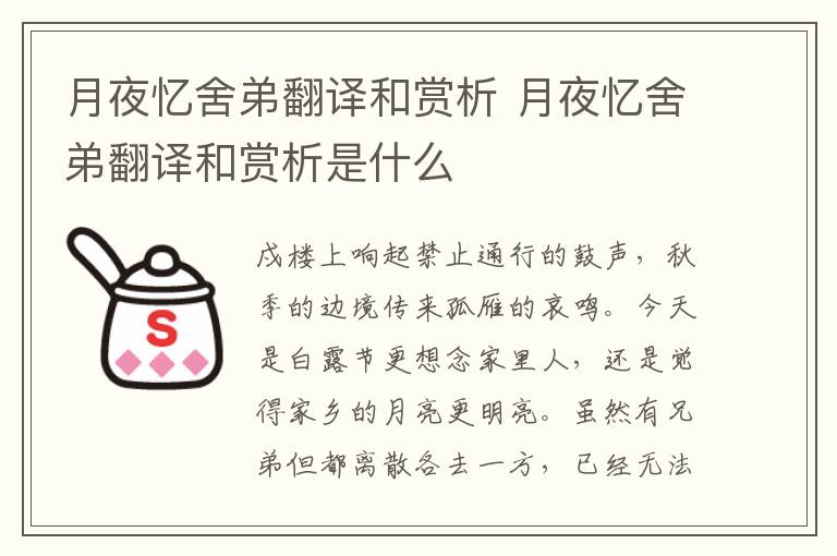 《月夜忆舍弟》的翻译是:戍楼上响起禁止通行的鼓声,秋季的边境传来孤雁的哀鸣。今天是白露节更想念家里人,还是觉得家乡的月亮更明亮。虽然有兄弟但都离散各去一方,已经无法打听到他们的消息。寄书信询问也不知道寄到哪里,因为天下依旧战乱不能太平。