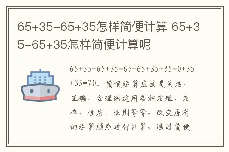 简便运算应该是灵活、正确、合理地运用各种定理、定律、性质、法则等等,改变原有的运算顺序进行计算,通过简便运算要大幅度地提高计算速度及正确率,使复杂的计算变得简单。简便计算是一种特殊的计算方式,它运用了数字的基本性质以及运算的定律,以达到让计算变得便捷的目的。常用的简便计算的方法有加法结合律、加法交换律、乘法结合律、乘法分配律、乘法交换律。在65+35-65+35的简便运算中,运用了加法结合律。