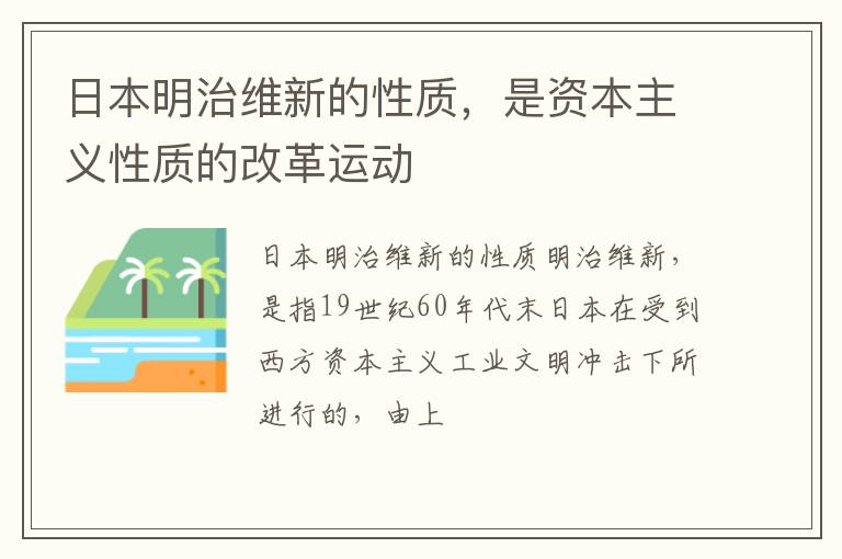 日本明治维新的性质是资本主义性质的改革运动。明治维新,是指19世纪60年代末日本在受到西方资本主义工业文明冲击下所进行的,由上而下、具有资本主义性质的全盘西化与现代化改革运动。这次改革始于1868年明治天皇建立新政府,日本政府进行近代化政治改革,建立君主立宪政体。经济上推行“殖产兴业”,学习欧美技术,进行工业化浪潮,并且提倡“文明开化”、社会生活欧洲化,大力发展教育等。这次改革使日本成为亚洲第一个走上工业化道路的国家,逐渐跻身于世界强国之列,是日本近代化的开端,是日本近代历史上的重要转折点。