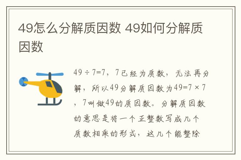 49怎么分解质因数 49如何分解质因数 知识分享 2月22日 编辑 童画 取消关注 关注 私信 49分解质因数的过程为:49÷7=7,7已经为质数,无法再分解,所以49分解质因数为49=7×7,7叫做49的质因数。 分解质因数的意思是将一个正整数写成几个质数相乘的形式,这几个能整除该正整数的质数就叫做这个正整数的质因数。 No related posts. 本文内容由互联网用户自发贡献,该文观点仅代表作者本人。本站仅提供信息存储空间服务,不拥有所有权,不承担相关法律责任。如发现本站有涉嫌抄袭侵权/违法违规的内容, 请发送邮件至 2245678901@qq.com 举报,一经查实,本站将立刻删除。 给TA打赏 共{{data.count}}人 人已打赏