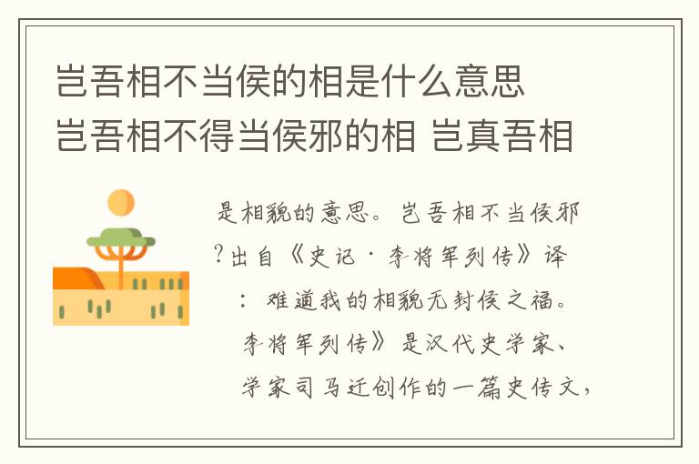 是相貌的意思。岂吾相不当侯邪?出自《史记·李将军列传》译为:难道我的相貌无封侯之福。《李将军列传》是汉代史学家、文学家司马迁创作的一篇史传文,载于《史记》卷一百零九。这篇文章通过描写被誉为“飞将军”的汉朝名将李广的机智勇敢、廉洁宽厚,以及有功不得封爵,最后被迫自刎的不幸遭遇,塑造了一位悲剧英雄的形象。文章叙事突出重点事件,善用对比手法,注重细节描写,是《史记》中的传记名篇。