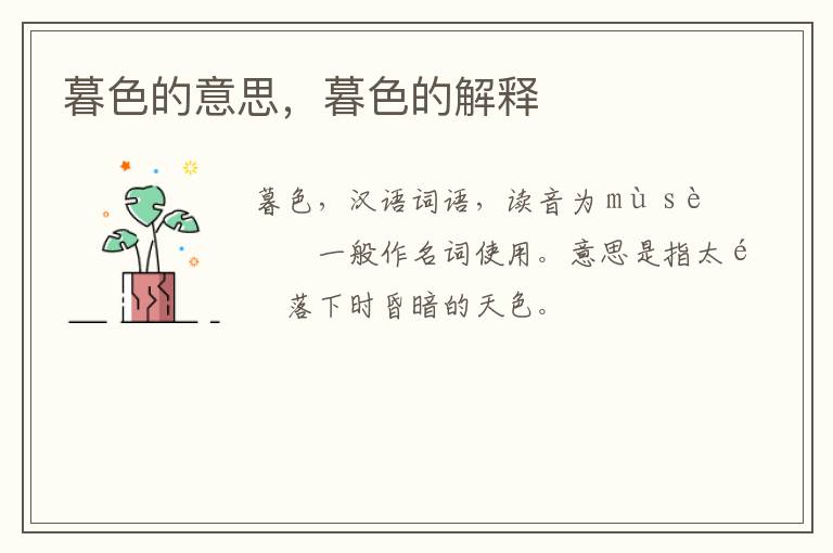 暮色的意思,暮色的解释 知识分享 2月22日 编辑 童画 取消关注 关注 私信 暮色,汉语词语,读音为mù sè,一般作名词使用。意思是指太阳落下时昏暗的天色。如:暮色笼罩了大地。暮色一词出自南朝宋鲍照《幽兰》诗之一:“倾辉引暮色,孤景留思颜。” 暮色的近义词有:夜色、黄昏、傍晚、晚霞 反义词有:曙光、晓色 词语造句:这时虽已暮色苍茫,但游人兴趣未减,大家玩得都很开心。 No related posts. 本文内容由互联网用户自发贡献,该文观点仅代表作者本人。本站仅提供信息存储空间服务,不拥有所有权,不承担相关法律责任。如发现本站有涉嫌抄袭侵权/违法违规的内容, 请发送邮件至 2245678901@qq.com 举报,一经查实,本站将立刻删除。 给TA打赏 共{{data.count}}人 人已打赏