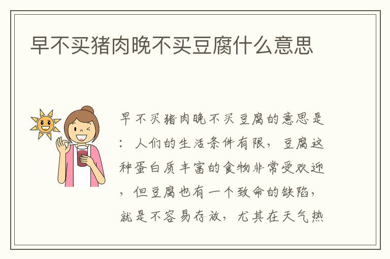 人们的生活条件有限,豆腐这种蛋白质丰富的食物非常受欢迎,但豆腐也有一个致命的缺陷,就是不容易存放,尤其在天气热的时候,往往经过一个中午就会发粘发酸,所以人们在晚上前后买豆腐,必然买不到新鲜的豆腐,甚至买到坏掉的豆腐。久而久之,人们就总结出了“晚不买豆腐”的俗语。