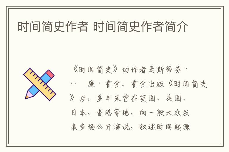 《时间简史》的作者是斯蒂芬·威廉·霍金。霍金出版《时间简史》后,多年来曾在英国、美国、日本、香港等地,向一般大众发表多场公开演说,叙述时间起源、宇宙终结、时光旅行,演说时其受欢迎程度犹如摇滚巨星。该书的定位是让那些对宇宙学有兴趣的普通读者了解他的理论和其中的数学原理。