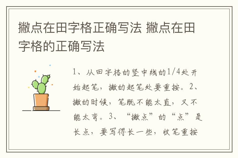 撇点在田字格里的正确写法:1、从田字格的竖中线的1/4处开始起笔,撇的起笔处要重按。2、撇的时候,笔既不能太直,又不能太弯。3、“撇点”的“点”是长点,要写得长一些,收笔重按。4、两个笔画之间的夹角约为90度,不可太大或太小。