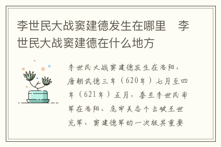 李世民大战窦建德发生在洛阳,唐朝武德三年(620年)七月至四年(621年)五月,秦王李世民率军在洛阳、虎牢关各个击破王世充军、窦建德军的一次极其重要战役。隋朝末年,烽烟四起,群雄争霸,唐高祖李渊攻克长安称“唐”,王世充据洛阳称“郑”,柏壁之战后,李渊为夺取中原,采取先郑后夏(窦建德已称夏王)、各个击破的方略。