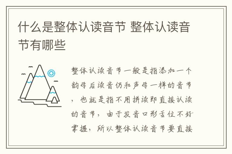 整体认读音节一般是指添加一个韵母后读音仍和声母一样的音节,也就是指不用拼读即直接认读的音节,由于发音口形舌位不好掌握,所以整体认读音节要直接读出。