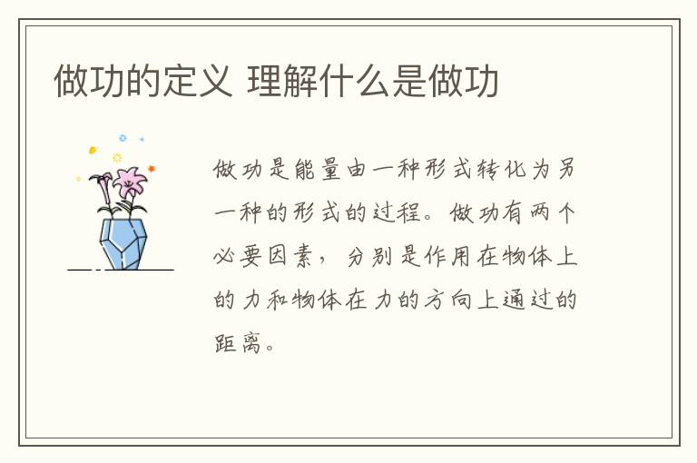做功是能量由一种形式转化为另一种的形式的过程。做功有两个必要因素,分别是作用在物体上的力和物体在力的方向上通过的距离。