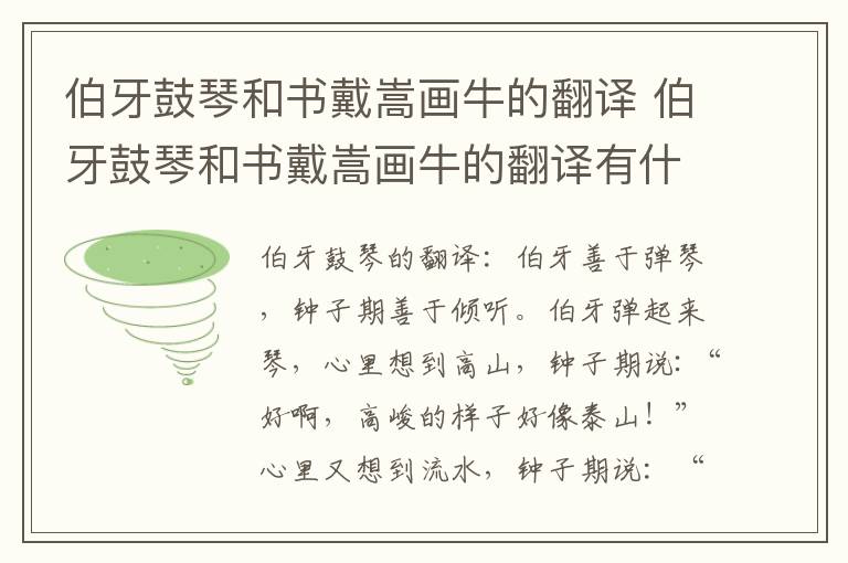 伯牙鼓琴的翻译:伯牙善于弹琴,钟子期善于倾听。伯牙弹起来琴,心里想到高山,钟子期说:“好啊,高峻的样子好像泰山!”心里又想到流水,钟子期说:“好啊,汹涌的样子好像江河!”不管伯牙心里想什么,钟子期都能准确地道出他的心意。子期死后,伯牙认为这世上再也没有知音了,于是就把琴摔碎,终生不再弹琴。书戴嵩画牛的翻译:四川有个杜处士,喜爱书画,他所珍藏的书画有几百种,其中有一幅是戴嵩画的牛,他尤其珍爱。