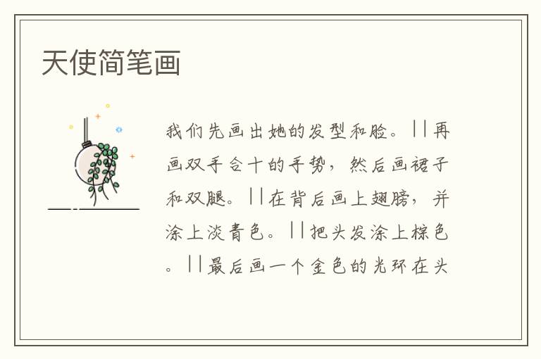 天使简笔画 知识分享 3月10日 编辑 童画 取消关注 关注 私信 1、我们先画出她的发型和脸。 2、再画双手合十的手势,然后画裙子和双腿。 3、在背后画上翅膀,并涂上淡青色。 4、把头发涂上棕色。 5、最后画一个金色的光环在头上就可以了。 No related posts. 本文内容由互联网用户自发贡献,该文观点仅代表作者本人。本站仅提供信息存储空间服务,不拥有所有权,不承担相关法律责任。如发现本站有涉嫌抄袭侵权/违法违规的内容, 请发送邮件至 2245678901@qq.com 举报,一经查实,本站将立刻删除。 给TA打赏 共{{data.count}}人 人已打赏