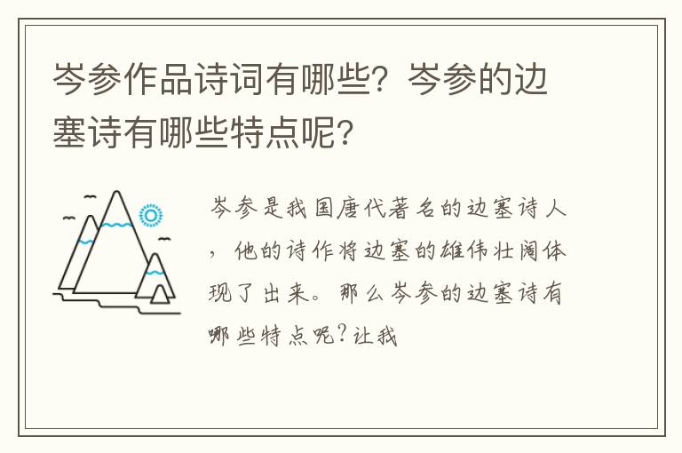 岑参是我国唐代著名的边塞诗人,他的诗作将边塞的雄伟壮阔体现了出来。那么岑参的边塞诗有哪些特点呢?让我们一同来探究一下吧。
