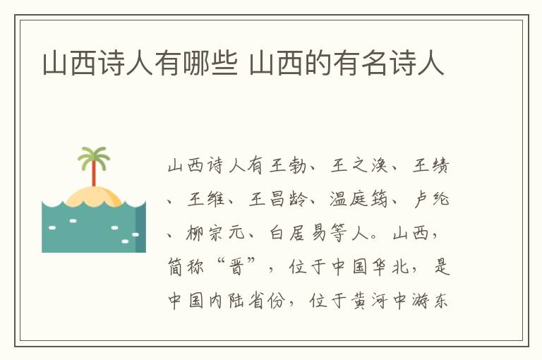 山西诗人有王勃、王之涣、王绩、王维、王昌龄、温庭筠、卢纶、柳宗元、白居易等人。山西,简称“晋”,位于中国华北,是中国内陆省份,位于黄河中游东岸。山西省的总面积为15.67万平方千米,占中国总面积的1.6%。