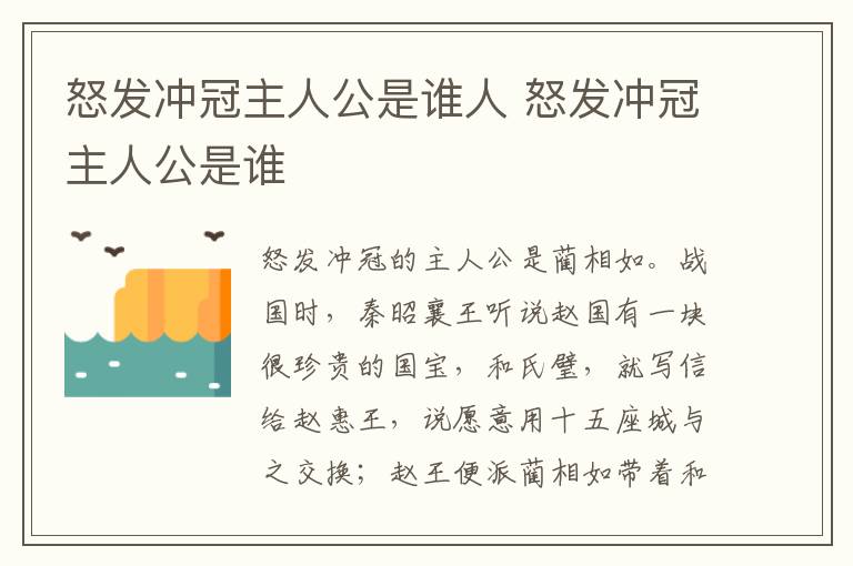 怒发冲冠的主人公是蔺相如。战国时,秦昭襄王听说赵国有一块很珍贵的国宝,和氏璧,就写信给赵惠王,说愿意用十五座城与之交换;赵王便派蔺相如带着和氏璧出使秦国。