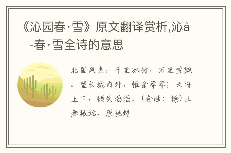 北方的风光,千万里冰封冻,千万里雪花飘。望长城内外,只剩下无边无际白茫茫一片;宽广的黄河上下,顿时失去了滔滔水势。山岭好像银白色的蟒蛇在飞舞,高原上的丘陵好像许多白象在奔跑,它们都想试一试与老天爷比比高。要等到晴天的时候,看红艳艳的阳光和白皑皑的冰雪交相辉映,分外美好。