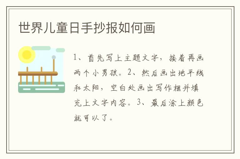 世界儿童日手抄报如何画 知识分享 3月10日 编辑 童画 取消关注 关注 私信 1、首先写上主题文字,接着再画两个小男孩。 2、然后画出地平线和太阳,空白处画出写作框并填充上文字内容。 3、最后涂上颜色就可以了。 No related posts. 本文内容由互联网用户自发贡献,该文观点仅代表作者本人。本站仅提供信息存储空间服务,不拥有所有权,不承担相关法律责任。如发现本站有涉嫌抄袭侵权/违法违规的内容, 请发送邮件至 2245678901@qq.com 举报,一经查实,本站将立刻删除。 给TA打赏 共{{data.count}}人 人已打赏