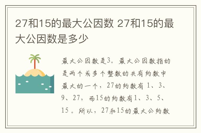 27和15的最大公因数是3。最大公因数指的是两个或多个整数的共有约数中最大的一个,27的约数有 1、3、9、27,而15的约数有1、3、5、15