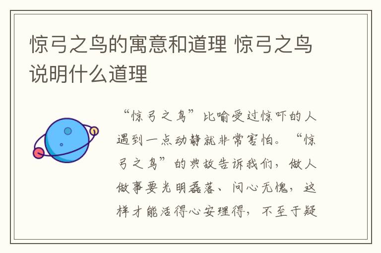 “惊弓之鸟”比喻受过惊吓的人遇到一点动静就非常害怕。“惊弓之鸟”的典故告诉我们,做人做事要光明磊落、问心无愧,这样才能活得心安理得,不至于疑神疑鬼、不堪一击。“惊弓之鸟”的典故出自《战国策·