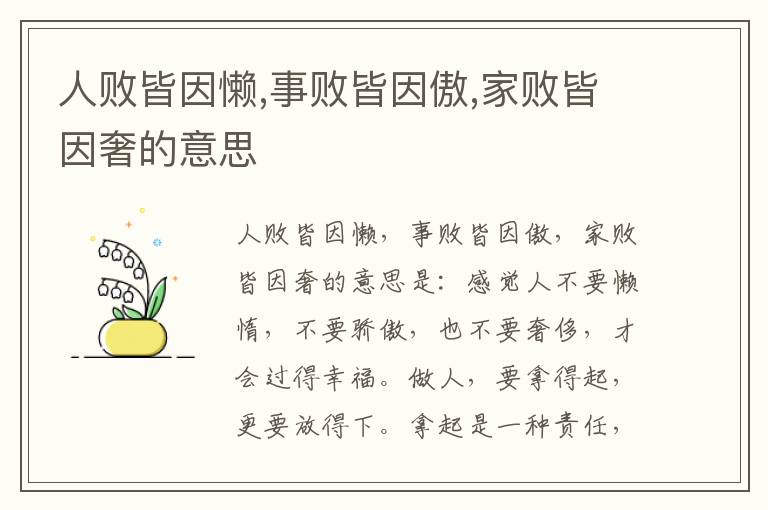 人败皆因懒,事败皆因傲,家败皆因奢的意思是:感觉人不要懒惰,不要骄傲,也不要奢侈,才会过得幸福。做人,要拿得起,更要放得下。拿起是一种责任,一种担当;放下是一种智慧,一种豁达!人生,是自己和自己的战争,我们要让积极的自己,打败消极的自己,放下消极,选择积极,去赢得自己,赢得生活。