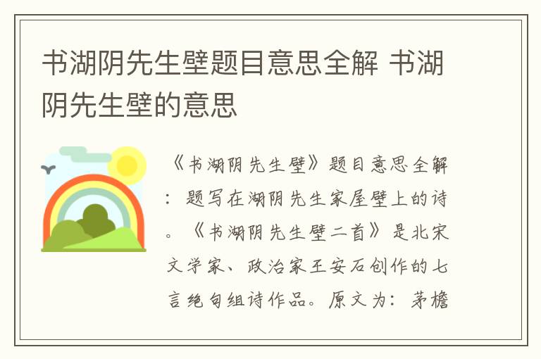 《书湖阴先生壁》题目意思全解:题写在湖阴先生家屋壁上的诗。《书湖阴先生壁二首》是北宋文学家、政治家王安石创作的七言绝句组诗作品。原文为:茅檐长扫净无苔,花木成畦手自栽。一水护田将绿绕,两山排闼送青来。桑条索漠楝花繁,风敛余香暗度垣。黄鸟数声残午梦,尚疑身属半山园。
