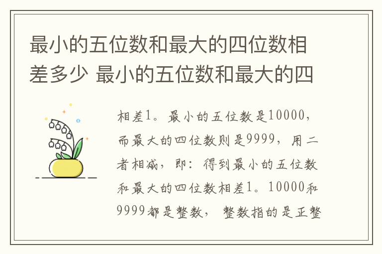 最小的五位数和最大的四位数相差1。最小的五位数是10000,而最大的四位数则是9999,用二者相减,即:得到最小的五位数和最大的四位数相差1。
