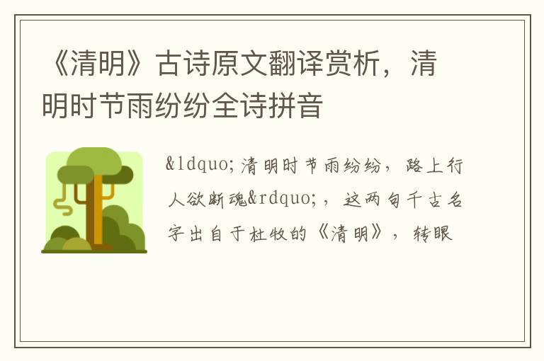 “清明时节雨纷纷,路上行人欲断魂”,这两句千古名字出自于杜牧的《清明》,转眼清明将至,今天就让我们一起来重温一下这首诗的拼音版吧。
