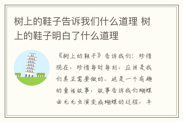 《树上的鞋子》告诉我们:珍惜现在,珍惜每时每刻,应该是我们真正需要做的。这是一个有趣的童话故事,故事告诉我们蝴蝶由毛毛虫演变成蝴蝶的过程,丰富了我们的知识。《树上的鞋》是小学四年级语文,作者是金波。