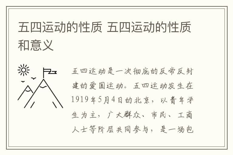 五四运动的性质是一次彻底的反帝反封建的爱国运动。五四运动发生在1919年5月4日的北京,以青年学生为主,广大群众、市民、工商人士等阶层共同参与,是一场包括请愿、罢工、暴力对抗政府等多种形式的爱国运动。