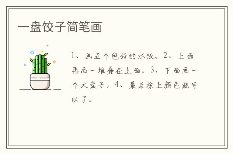 一盘饺子简笔画 知识分享 3月12日 编辑 童画 取消关注 关注 私信 1、画五个包好的水饺。 2、上面再画一堆叠在上面。 3、下面画一个大盘子。 4、最后涂上颜色就可以了。 No related posts. 本文内容由互联网用户自发贡献,该文观点仅代表作者本人。本站仅提供信息存储空间服务,不拥有所有权,不承担相关法律责任。如发现本站有涉嫌抄袭侵权/违法违规的内容, 请发送邮件至 2245678901@qq.com 举报,一经查实,本站将立刻删除。 给TA打赏 共{{data.count}}人 人已打赏