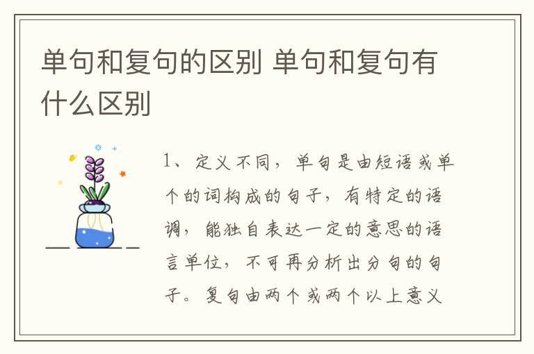 1、定义不同,单句是由短语或单个的词构成的句子,有特定的语调,能独自表达一定的意思的语言单位,不可再分析出分句的句子。复句由两个或两个以上意义相关,结构上互不作句子成分的分句组成。2、构成数量不同,单句由单个词或短语构成,复句则由两个或两个以上分句构成。3、构成成分不同,单句构成成分为词语或短语,复句构成成分为句子。
