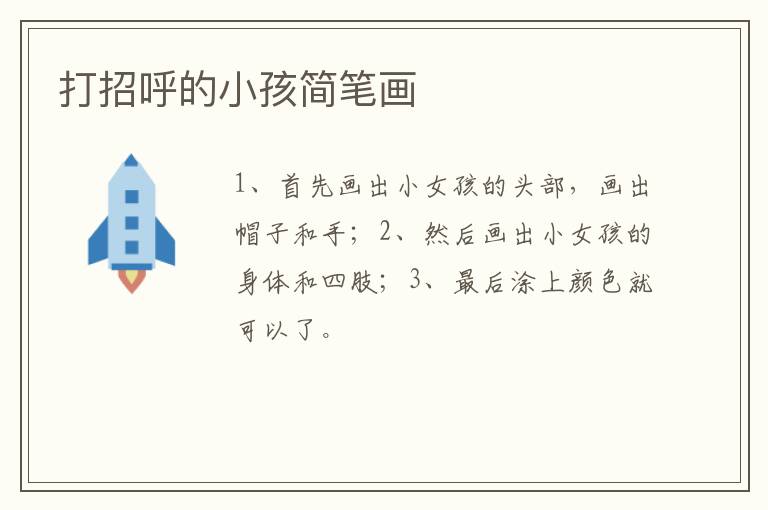 打招呼的小孩简笔画 知识分享 3月12日 编辑 童画 取消关注 关注 私信 1、首先画出小女孩的头部,画出帽子和手; 2、然后画出小女孩的身体和四肢; 3、最后涂上颜色就可以了。 No related posts. 本文内容由互联网用户自发贡献,该文观点仅代表作者本人。本站仅提供信息存储空间服务,不拥有所有权,不承担相关法律责任。如发现本站有涉嫌抄袭侵权/违法违规的内容, 请发送邮件至 2245678901@qq.com 举报,一经查实,本站将立刻删除。 给TA打赏 共{{data.count}}人 人已打赏