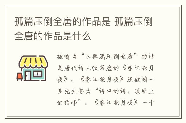 被喻为“以孤篇压倒全唐”的诗是唐代诗人张若虚的《春江花月夜》。还被闻一多先生誉为“诗中的诗,顶峰上的顶峰”。《春江花月夜》一千多年来使无数读者为之倾倒。一生仅留下两首诗的张若虚,也因这一首诗,被称为“孤篇横绝,竟为大家”。